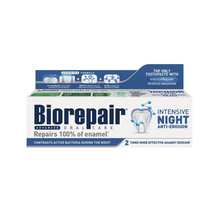 - Biorepair® Advanced Intensive Night Repair Toothpaste is a comprehensive repair toothpaste, using exclusive patented formula microRepair® (biomimetic nanoparticles) to protect our enamel and dentin, effectively disinfected from bacteria inside your mouth, reducing the rate of bacterial growth and strengthen teeth protected against erosion, and so maintaining long-term protection and health. Daily use can prevent from tooth damage, and also reduce the formation of plaque, tartar and cavities.