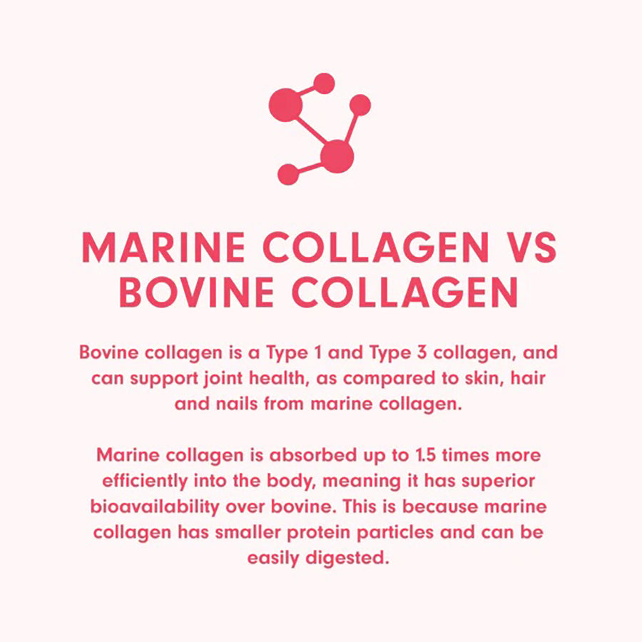 Good Collagen is made from marine collagen peptides - more bioavailable than collagen as they are made up of shorter chains of amino acids than collagen. This makes them a more potent source of collagen that can be better absorbed by the body. Benefits include support for your hair & nail health, skin elasticity, digestive & gut health, and joint health.
